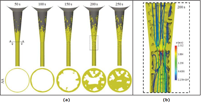 图101 (a)水口内堵塞的演变(UNILEOB-SMMP), (b)200秒后的在堵塞的水口内钢水流动
