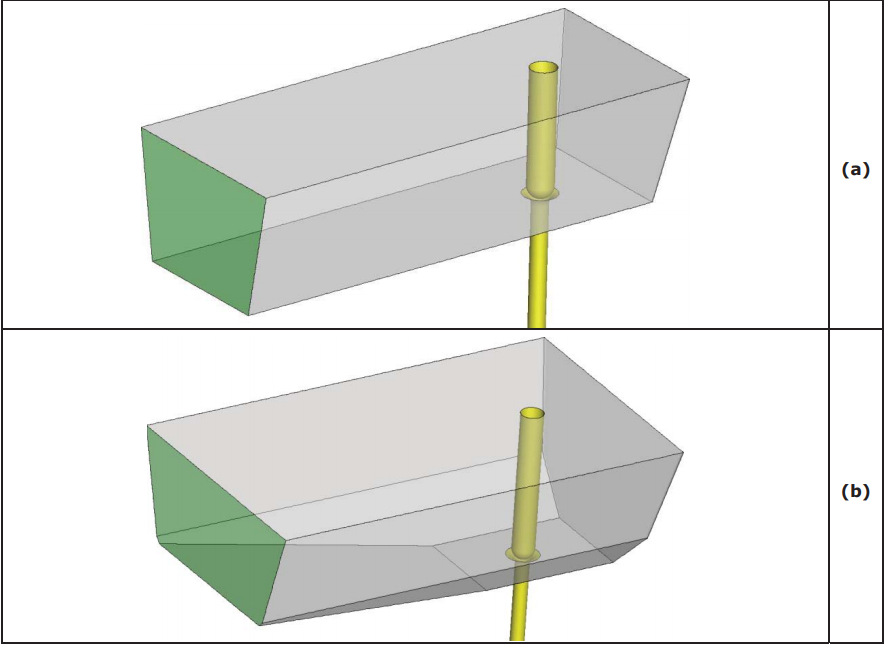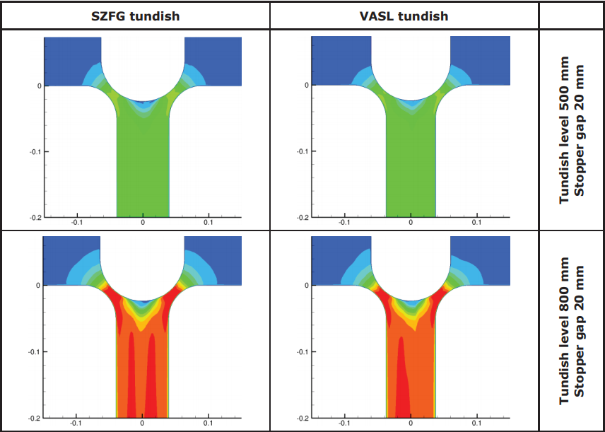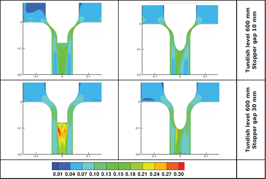 在以前的RFCS研究项目中,推导出了一种新的塞棒几何形状[5],该设计的目的是修改钢水流动条件,导致流向平行于水口内壁墙。其基本思想是避免流动再循环,加速钢水靠近水口,以防止堵塞沉积。考虑的结果是设计一个漏斗形的水口,应使钢水流方向向下,平行于水口内壁,避免在水口内壁墙处形成回流区。然而,这种设计的应用将在塞棒下方形成另一个回流区,假定在这个位置,回流区不会引起堵塞问题。此外,惰性气体通过塞棒头部喷射也会对其产生影响。漏斗形塞棒设计进行了三种修改:一种是和原来相近的平头,两种是椭圆头,目的是避免塞杆下方的回流区,不同的椭圆形修改是一个20毫米的扩展。这些修改如图117所示,其中塞棒为白色,钢水为灰色。考虑了两个塞棒升高(10mm和25mm)的参数,以及两个中间包钢水液面高度(500mm和800mm)。这些方法在SALZF钢厂连铸机中进行了数值试验。