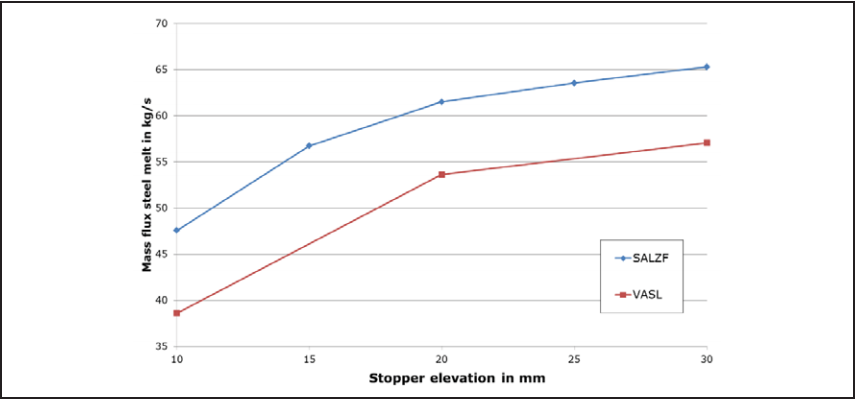SALZF钢厂和VASL钢厂的连铸机配有不同内径的浸入式水口, SALZF钢厂为φ80 mm, VASL钢厂为φ75 mm。图105显示了在中间包钢水液面高度决定塞棒升高量,从而保持钢水流通量。塞棒升高量在10mm到30mm之间,钢水流通量的的上升是一个渐近的过程,即对于塞棒上升到一定情况,钢水流通量似乎接近一个恒定值。显然,小间隙的流体机械阻力与所产生的钢水流通量之间是不成比例的关系。