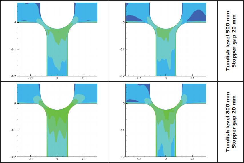在WP3工作中,两个钢厂的工业生产连铸机形状和参数用来进行数值模拟非金属夹杂物的团聚和水口内壁上的沉淀,并对塞棒端部的形状进行修改设计,改变钢水流动使得钢水进入水口后沿着内腔壁平行向下平行流动,对此进行了调研。