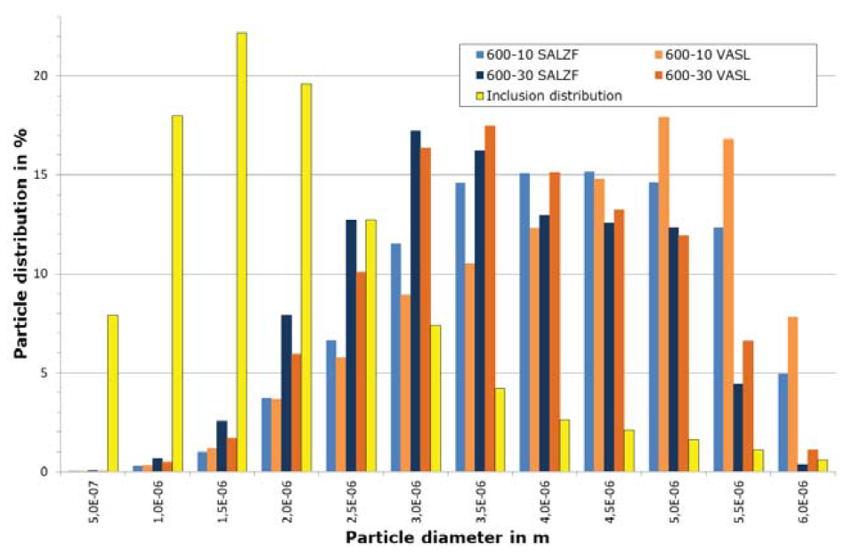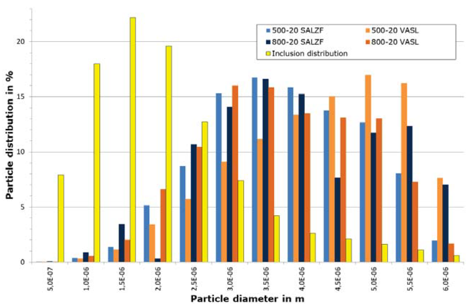 图110再次显示了两个钢厂连铸机在不同中间包钢水液面下的相应结果,结果表明,SALZF钢厂连铸机在2.5 ~ 5.0 μm范围内的结果差异不大,只有一个异常值,但速度和湍流度有明显差异。对VASL钢厂连铸机的团聚计算结果表明,在800 mm中间包液面高度下,夹杂物团聚峰值为3.0 μm;在500 mm液面高度时,夹杂物团聚峰值为5.0 μm。这意味着中间包充液面较低,随着充液面较低,非金属夹杂物尺寸越大。中间包液面高度对VASL钢厂的连铸机结果很敏感。在SALZF钢厂500-20(中间包钢水液面高度500mm,塞棒提升20mm)情况下,直径φ2.0 μm的夹杂物消失了,这里不能进行详细的解释,并被判定为异常值。