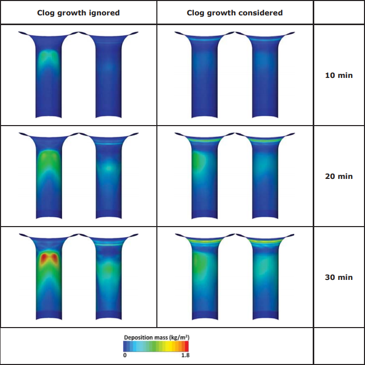 为了描述流体流动和阻塞增长之间双向耦合的重要性,进行了一个附加的数值模拟,忽略了阻塞增长的步骤。这是通过在撞击壁面后去除非金属夹杂粒子来实现的。不同时间浸入式水口SEN壁上颗粒沉积质量分布如图112所示。两种情况下的所有模拟设置是相同的。只有一种情况(左列)忽略了堵塞增长步长,即左列为单向耦合结果,右列为流体流动与堵塞增长的双向耦合结果。考虑到阻塞的生长,将计算单元的夹杂物沉积凸出水口内腔壁面上,可以比较两种情况(考虑和不考虑阻塞生长步骤)的沉积质量结果。两种模拟的粒子注入速率均为1.21 x 10-4 kg/s。结果表明,两种情况下颗粒沉积的临界区域即堵塞是不同的,在无阻塞生长的情况下,临界区在塞棒和水口的间隙区以下。考虑到堵塞的增长显示了额外的夹杂物沉积,即间隙似乎也是堵塞的关键因素,因此,忽略阻塞生长对颗粒沉积的影响可能会导致模拟结果的错误。
