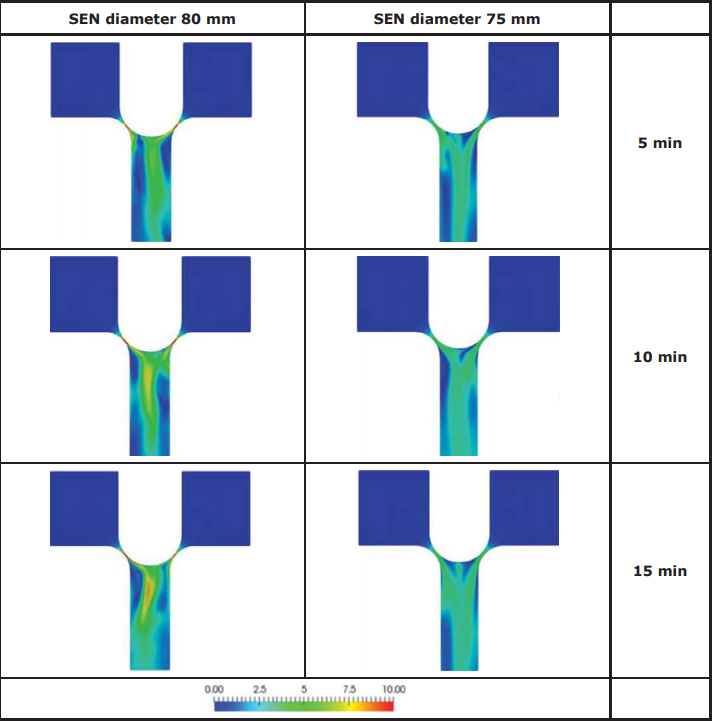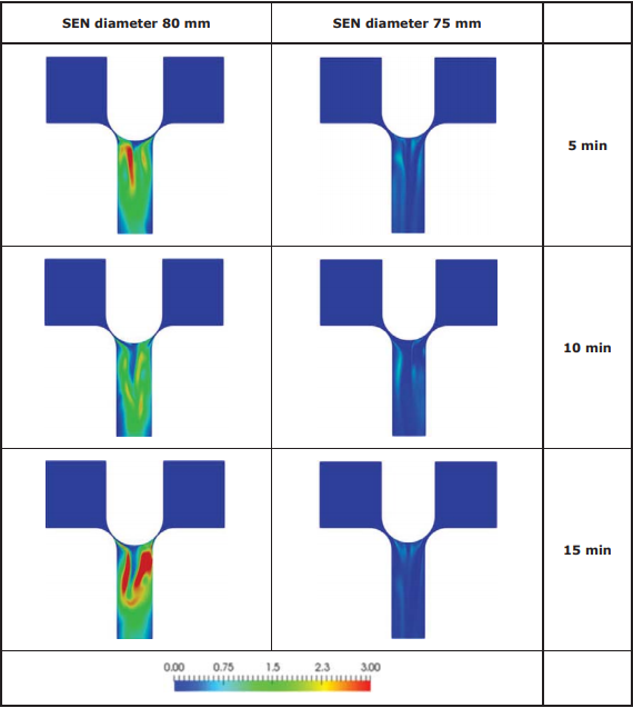 可以从两个不同水口流动模型发现可能的原因,较大直径的水口需要较小的塞棒间隙尺寸,以保持钢水流通量恒定,因此,如图115和图116所示,相对于较小水口,较大水口内的钢水速度和湍流动能都较大。在这里,速度和湍流动能用三次不同的时间段说明。