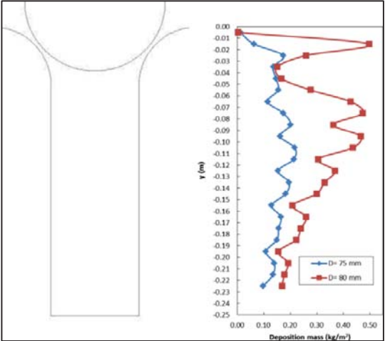 SALZF钢厂和VASL钢厂的连铸机的塞棒和水口对堵塞的影响进行了研究,两种连铸机靠近塞棒区域的几何形状相似,仅仅是水口内径不同,即VASL钢厂为φ75mm, SALZF钢厂为φ80mm。因此,建立了两个不同水口直径和不同间隙尺寸的数值域,以保持两种情况下钢水流通量恒定。两种水口直径下的夹杂物颗粒沉积质量结果如图114所示,结果表明,SEN直径越小,颗粒堵塞量越小,夹杂物颗粒沿水口内壁沉积越均匀。