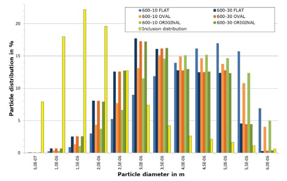 图122显示了改进的塞棒头部几何形状和中间包钢水液面高度对夹杂物团聚的影响。可以得出两种不同方向的观察结果,与原来的塞棒头部几何形状相比,椭圆形的修改大致讲是增加了非金属夹杂物的直径。只有最大中间包高度800mm和最大水口直径两个因素的影响不能确认。对于塞棒头部平面的修改,可以发现夹杂物朝向更小直径的轻微趋势,但必须指出的是,这一发现确实只是微弱的。
