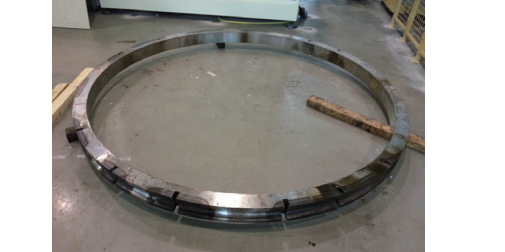 易孚迪感应加热设备(上海)有限公司自行研发设计针对风力发电行业转盘轴承感应淬火机床并已经大量在用户现场使用。为保障设备高精度和稳定性,设备系统硬件采用840D SL 数控系统,NCU720.3 PN(V3.2)版本。该设备可以针对重达10t、最大工件外径6m的转盘轴承进行热处理。老式的转盘轴承感应加热设备一般通过人工手动找加热位置,且在加热过程中无有效的跟踪方式,导致工件变形严重,极大地影响了产品质量和使用寿命。我公司针对老式设备的缺点,采用西门子840D SL系统自带的探头功能来处理全自动精确找加热起始位置,且在整个加热过程中通过系统快速模拟量功能来实时跟踪加热感应器与工件的距离,然后通过NC程序高精度动态响应进行伺服轴补偿的原理,以保证整个加热过程中感应器与工件之间的间隙保持一致,从而保证整个工件热处理工艺的稳定性。