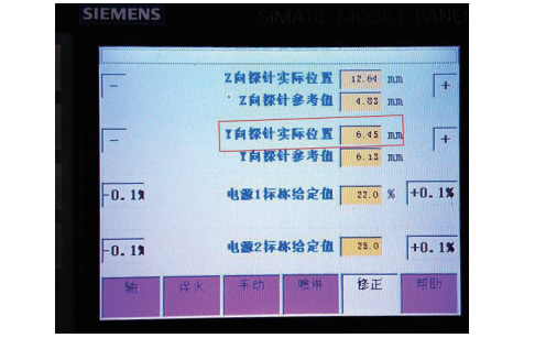 图2中黑色模块为控制器本体。控制器上带LED显示屏,其数值为传感器测量头的实际位置,按钮则可调整控制器输出功能。连接传感器的电缆由模块进线端接入,模块输出端连接电缆连接到ET200S模拟量检测模块。通过PLC可以读取系统模拟量数值传送至HMI显示设置标准值和实际值,方便操作者观察实际偏差距离与设置的是否一致,如图3所示。