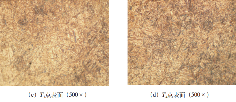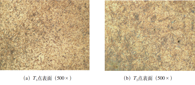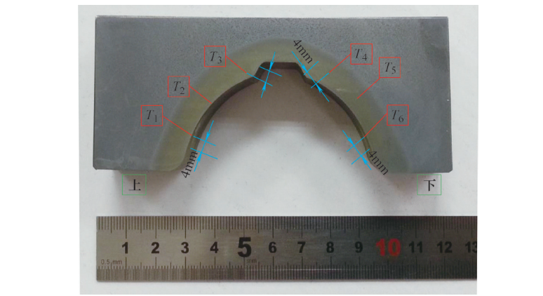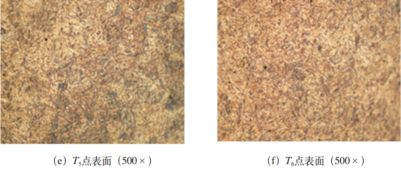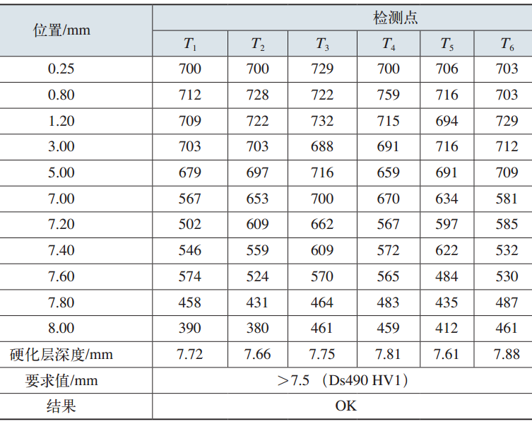 产品:外圈沟道FLHSN3035FT1,材质为42CrMo4+QT-EN10083,沟道淬火硬度58~62HRC,硬化层深度≥7.5mm(52.5HRC处)。实物如图4所示,图样工艺要求如图5所示,硬化层切割试块如图6所示,检测结果见附表,金相组织如图7所示。