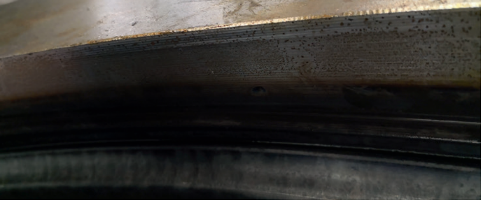 转盘轴承套圈裂纹均位于套圈内径靠近端面处,每件套圈裂纹数量不等,裂纹多沿圆周方向分布,长短不一,最长裂纹约延伸3/4圆周,个别裂纹尾部已延伸至端面,裂纹套圈轴承宏观形貌如图1所示,其中一处裂纹形貌如图2所示。