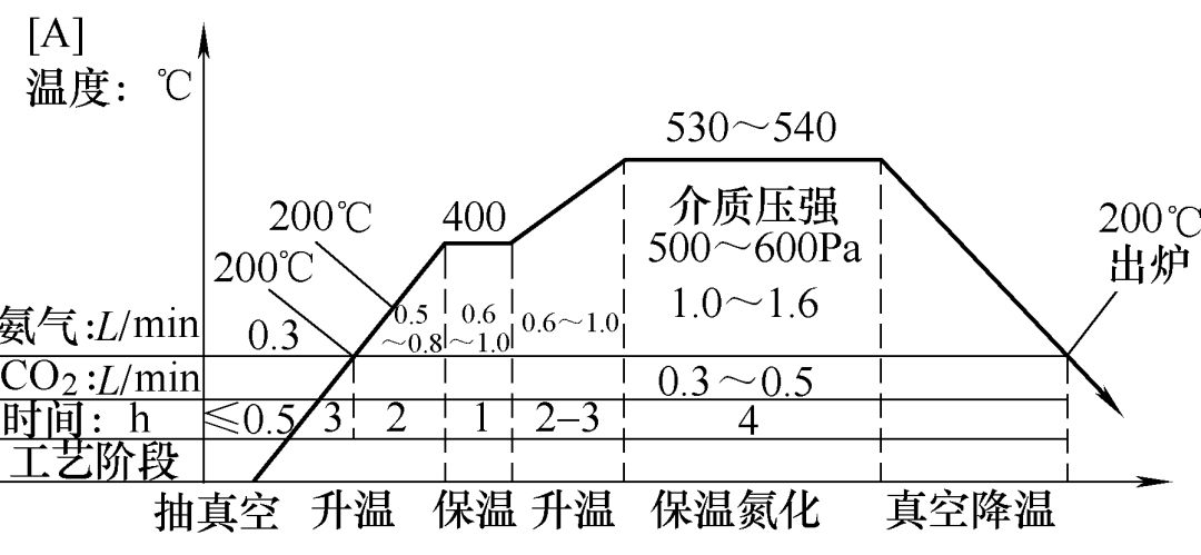 当炉温到530℃时,进入恒温保温氮化阶段,通氨气1.0~1.6L/min、二氧化碳0.3L/min,调整通氨量、真空泵抽气速度,使介质压力达500~600 Pa,保温4h。