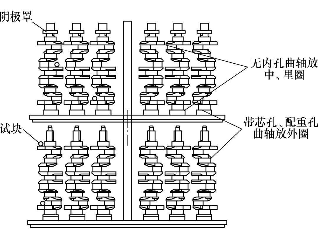 把图1所示的有芯孔、配重孔的4105型曲轴放外圈。因起辉面积大,相对温度高,靠近炉壁,散热快;无内孔四缸曲轴(如朝柴4102),没辉光集中造成的偏高温度,放中圈和里圈。中圈、里圈散热条件差,如图3所示。