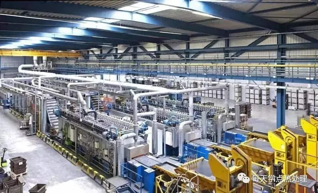 1一转底式加热炉 2一淬火压床 3一淬火油槽 4一液压机 5一上下料台 6一运料小车 7-箱式回火炉 8一清洗机 9一多用炉 10一行车