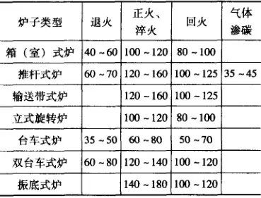 选择热处理炉型时,应根据热处理件特点、工艺要求和批量,合理选择炉型。以下是几种常用的炉型选择:(1) 汽车齿轮类渗碳零件,大批量生产时,一般选用推杆式连续渗碳淬火自动线;中批量生产时,选用密封箱式炉组成联动线;小批量生产时,应优先选用密封箱式炉完成渗碳淬火,尽量避免使用井式渗碳炉,以避免工件在空气介质中入油淬火带来的表面氧化脱碳。(2) 轴承类零件,根据零件大小,一般选用辊底式炉、铸链式炉、推杆式炉或网带式炉组。成自动生产线;而滚珠多选用鼓形炉组成的自动生产线。(3) 长轴件,大批量时,选用辊底式炉生产线(也可选用感应加热淬火回火自动生产线);小批量时,选用井式炉或台车炉。(5) 中小标准件,选用铸链炉、网带式炉、振底炉。(6) 工具、模具、刃具,优先选用真空炉,也可选用流态粒子炉、盐浴炉。(7) 钢带等退火件,推广应用保护气氛罩式炉、井式炉和箱式炉。热处理炉生产率是指某热处理炉在1h 内可完成某热处理工序零件的重量,即kg/h。它与炉型、功率、炉膛尺寸、工艺类型、零件装夹方式等因素有关。几种炉型单位炉底面积的平均生产率见表5。平均生产率是指热处理炉在一般正常生产条件下所达到的生产率。热处理炉产品样本所标出的生产率数值,通常是指该设备可能完成的最大生产率。车间设计时,应根据零件或代表产品实际排料计算设备的平均生产率。几种典型设备的平均生产率按如下方法计算: