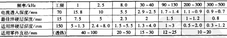 (1) 频率选择。感应加热所需电流频率,取决于产品零件对淬硬层深度的要求。表6为感应加热电流透入深度与淬硬层深度的合理频率范围。