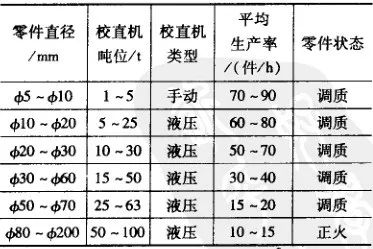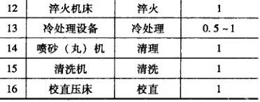 集油槽的容积(m³) : V2= (V1 +全车间循环淬火油槽总容积)×1.2 (3) 清洗设备。清洗设备有连续式、室式、槽式等清洗机和清洗槽。多数清洗机是与加热淬火设备配套使用的,作前清洗或后清洗用。应根据多数热处理件的批量和加热淬火炉的操作方式选择。(4) 清理及强化设备。清理及强化设备主要用于清理零件热处理后表面的氧化皮或进行表面强化用。该设备(如喷丸机、酸洗槽、清理滚筒)多有粉尘、酸气、噪声等污染环境物,因此,多数独立设置。可按处理量计算所需的设备量。(5) 校直设备。热处理后的弯曲工件需要用手动或机械校直。小型零件用手动螺旋压床或齿条压床,中型、大型零件用液压机。一般零件所需校直机的参数见表13。