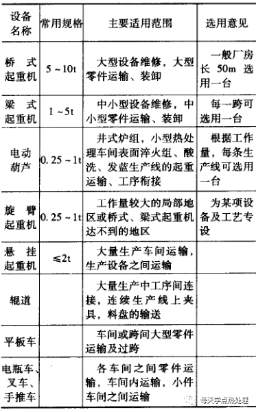 (6) 起重运输设备。起重运输设备应根据设备安装、修理、工艺所需起吊运输最大重量以及工艺平面布置确定,起重运输设备的适用范围及选择原则见表14。