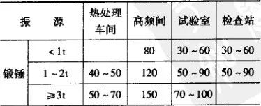 热处理车间产生有害气体,如蒸汽、油烟、粉尘等,应位于机加工、装配等车间的下风向(按项目建设地主导风向)。一般车间考虑采光、自然通风要求的间距要满足消防、环保等现行规范的要求,同时应≥10m。近年随着钢结构厂房的推广应用,对少、无污染的热处理车间也可与机加工、装配车间组建成联合厂房。热处理车间应与锻造车间、铁路等保持一定的防振间距,或采取相应的隔振措施。防振间距见表16。
