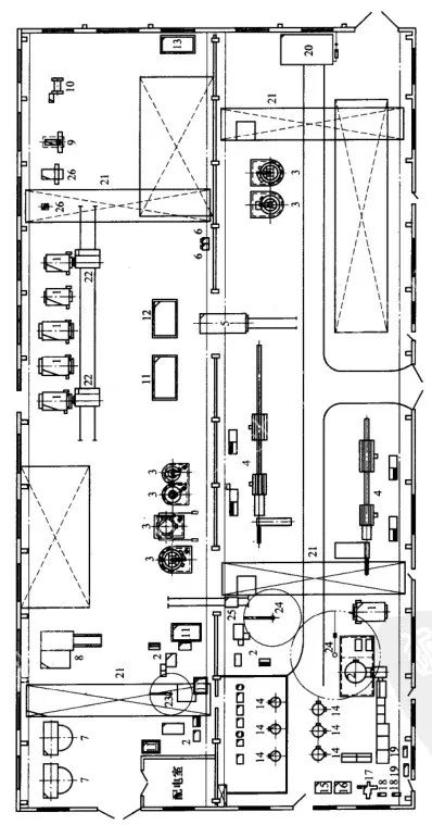 1一箱式电阻炉 2一停火机床 3一井式回火电阻炉 4一中额摔火回火自动线 5一台车式电阻炉 6-实验电阻炉 7一描丸机 8-清淀机 9一校直机10一摩擦压力机 11一水檀 12-痒火池糖 13一循环水槽 14一中顿感应加热装置15-体火水槽 16一冷却水槽 17一工具模床 18一砂轮机19-电焊机 20-油槽 21一桥式起重机 22一旅拉料小车 23一播臂吊架 24一平衡吊 25一平板车 26-硬度计1-上下料台 2一多用炉 3一箱式间火炉 4一清洗机 5一运料小车 6一淬火机床 7一高频加热装置 8一低温冰箱 9一真空粹火炉 10一干燥箱11一辉光离子滤氨炉 12一机床 13一桥式起重机 14一校直机 15一井式回火电炉 16一冷却水槽 17一抛丸机 18一悬骨起重机19-磁粉探伤机 20一盐浴炉 21-确盐炉 22一淋火精 23一箱式电照炉 24一台车式电肌炉