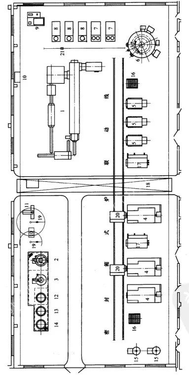 1一连续式气体渗碳淬火回火自动线 2一井式回火电阻炉 3-井式渗碳炉 4一密封箱式炉 5-一箱式同火炉 6-转底式光亮淬火炉 7一芯轴淬火装置 8一锌火压床 9-循环油植 10一检验平台 11一校直机 12一淬火油槽 13一碱洗槽 14一清洗槽 15一吸热式气氛发生器16一备料台 17一清洗机 18一桥式起重机 19一平衡吊 20一推拉料小车 21-手动单轨吊车