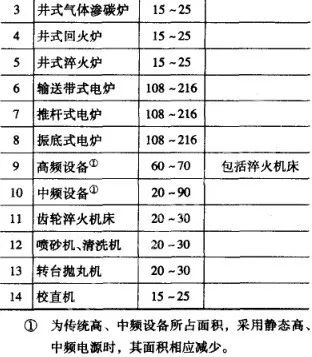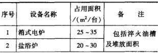 (2) 热处理设备面积指标。各类热处理设备所占车间面积指标如表19所示。