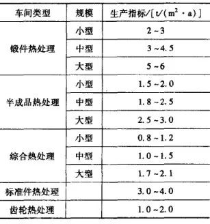 (1) 生产面积指各主要工序、辅助工序及与生产、辅助工序有关的操作所占的面积。如加热炉、加热装置、淬火槽等本身所占用的面积,操作所需的面积及工人在操作时所需的通道面积均属于生产面积。校直、检验所占用面积也算在生产面积内。生产面积约占车间总面积的70%~80%。(2) 辅助面积指服务于生产而不参与主要工作和辅助工作的机构。包括车间配电室、变频间、电容器间、检验室、车间试验室、保护气氛制备间、机修间、仪表间、通风机室、油循环冷却室、辅料库、主要通道、地下室及车间办公室、生活间等所占用的面积。辅助面积约占车间总面积的20%~30%。(1) 各类热处理车间面积指标。各类热处理车间每平方米总面积生产指标,如表18所示。