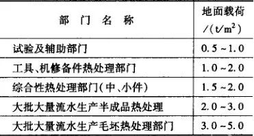 (1) 位置:高频间及中频间应单独设置,其位置应放在车间的上风向和非发展方向的一端,远离油烟、灰尘和振动较大的设备。(3) 封顶及隔断:高频间的封顶高度不低于4.5m, 中频发电机室的封顶高度一般为5.5~6.0m, 具体视设备大小和单轨轨顶高确定。(4) 门窗:应设置足够的窗户,以利采光及自然通风。高频间及中频发电机室门的尺寸一般为:2.1mx2.7m。(5) 高频间屏蔽:高频间一般采用Φ1mm钢丝制成5mmx5mm 的钢丝网,或用0.5~0.6mm厚的钢板进行屏蔽;门、窗用双层钢丝网屏蔽;金属屏蔽层必须接地,以保安全。凡引入屏蔽间的管道,其四周应与屏蔽层焊牢,并采取措施切断屏蔽层与管道系统的导电连接。电源必须经过滤波器,然后引人屏蔽间,以抑制通过导线传播干扰。热处理车间地面载荷取决于生产设备,可参照表22设计。