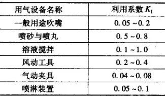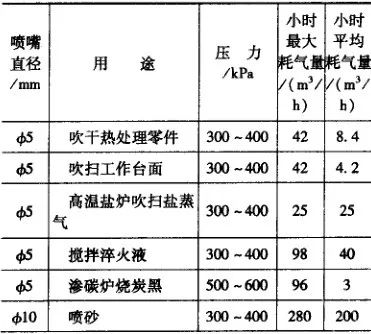 用于喷丸、吹干等用途的压缩空气消耗量可参考表 27 进行计算。各设备压缩空气年消耗量=小时平均消耗量×设备负荷率x设备设计年时基数。车间压缩空气年消耗量=各设备年消耗量之和×不正常损耗系数(一般取1.3~1.4) 。