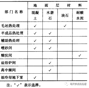 热处理厂房的地面材料要求耐热、耐蚀、耐冲击,应根据车间生产工艺选择,见表23。