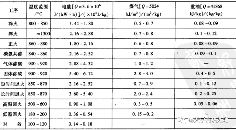 移动式用电设备,应注明其工作区域及供电方式(如滑触线或电缆)。电动葫芦、梁式和门式起机及电动平板车,应在工艺平面布置图上,标出滑触线起止位置和电缆供电点位置。一般用电设备或只带一般降压用变压器的设备,如以电动机为动力的设备及电阻炉等,安装以kW为单位;带专用变压器的设备,如高频电源、磁粉探伤机等,安装容量以kVA为单位。当设备需要的电源不是一般常用的交流、380V、50Hz时,应在设备明细表的技术规格栏中注明。存放易燃、可燃或易爆物质的场所及存在易燃易爆的气体或大量粉尘的场地,应注明储存物品的名称、数量或气体(粉尘)的成分和含量。当工作场地存在腐蚀性气体、蒸汽或特别潮湿时,以及存在高温、强烈振动或辐射时,应予注明。热处理车间工艺设计人员仅需提出车间的照明要求和照明区域等资料,由电气专业设计人员依据车间特性和照明面积进行计算和设计,统筹考虑工作地的照明、局部照明和事故照明等。热处理车间用电设备电能耗量的计算方法有:按设备负荷时数计算和按产量计算。由于按设备负荷时数法计算耗电量困难较多,且误差较大,一般按单位产品产量的耗电指标计算。粗略计算时,可依单位质量工件耗电量指标和车间生产量计算。表24为各热处理工序加热1kg金属所需电能、煤气、重油概略指标。▼表24 各种热处理工序加热1kg金属所需能源消耗指标