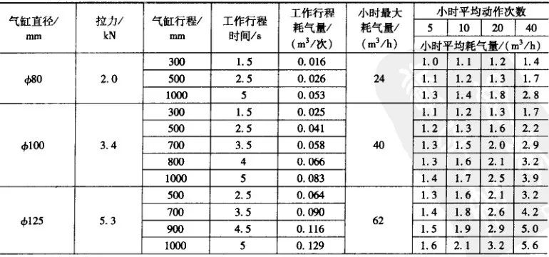 气缸工作用压缩空气消耗量,可以依据气缸的容积、单位时间内起动次数和所用的压力进行计算。炉门升降气缸压缩空气消耗量可按表 26 提供的数据计算,其