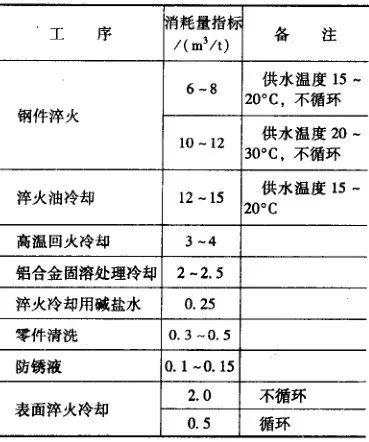 根据目前各地自来水水质情况,除个别地区外,均可满足感应加热设备的用水要求,如达不到标准要求的,可采用蒸馏水,或采用离子交换树脂软化水。热处理工艺操作的耗水量的计算,通常按工序每吨工件水消耗量指标作概略计算,如表29所示。车间用水应尽可能循环使用。