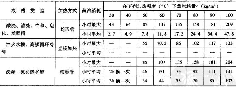 热处理车间使用蒸汽为饱和蒸汽,常用压力为200~400kPa.蒸汽的比热容,一般取较低数值,即2100kJ/kg。表33为各类液槽蒸汽消耗量的概略计算指标。