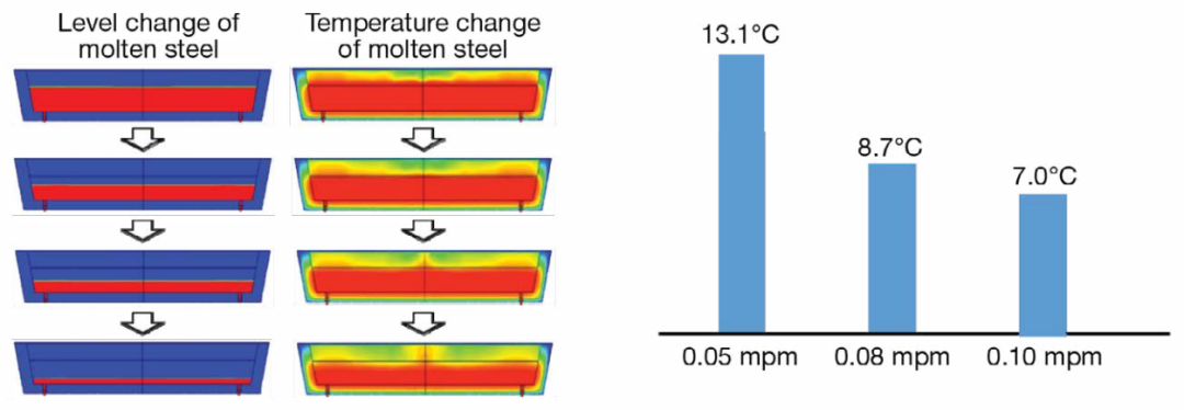 由于PosMC的浇注速度很低,为防止钢水堵塞中间包水口,中间包出口处的钢水温度至关重要。在PosMC工艺中,当钢包到中间包和中间包到结晶器的钢水下行时,钢水不堵塞水口和塞棒的钢水温度降要最小化。PosMC的中间包通过安装较厚的耐火材料和绝缘板来最大限度地减小钢水温度降。在0.05 m/min的浇注速度下,最大温度降在13.1℃以内,PosMC能够在不堵塞水口的情况下将钢水传入结晶器内,即使在很低的浇铸速率下,钢水也能够正常从中间包下行到结晶器内。