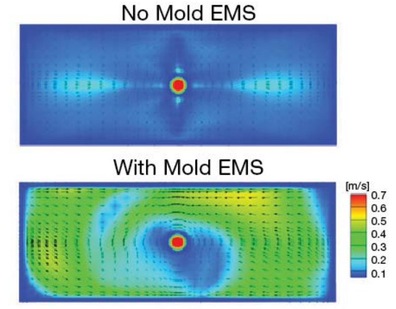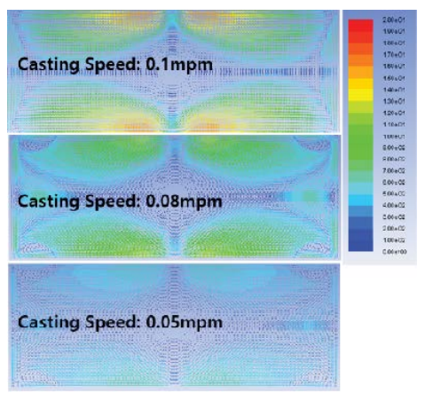 PosMC的SEN设计是的一个思想是减少结晶器钢水液位的波动,以得到均匀平静的结晶器钢水液面。在小于0.1 m/min的拉速情况下,由于流速小于0.1 m/min,存在表面钢水冻结的风险,如图2所示。为防止钢水液面冻结,结晶器周围采用电磁搅拌(EMS)线圈布置。在ANSYS Fluent中分析,通过电磁场耦合的方法,计算了EMS模型中结晶器内的钢水流动行为,在弯月面内得到均匀的钢水温度和稳定的钢水流动,如图3所示。