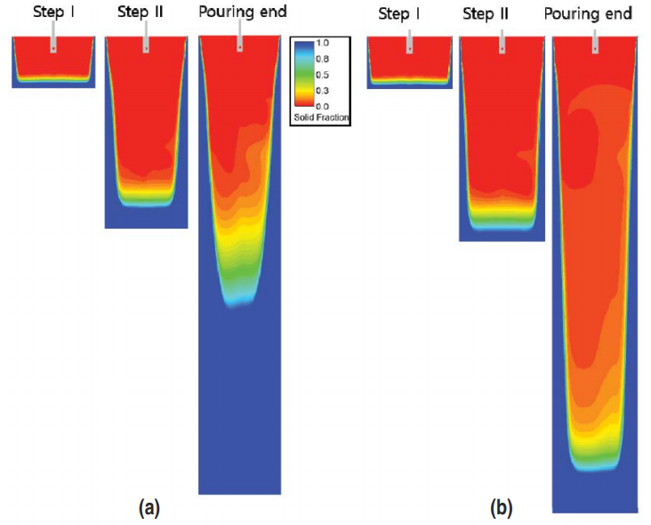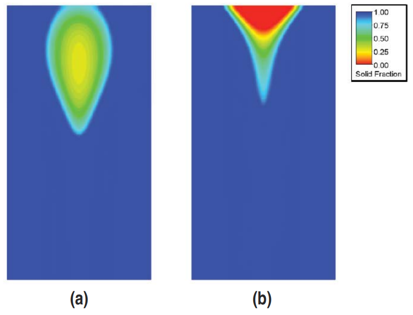 图4 结晶器内采用的凝固模拟:(a)0.05 m/min拉速,(b)0.10 m/min拉速