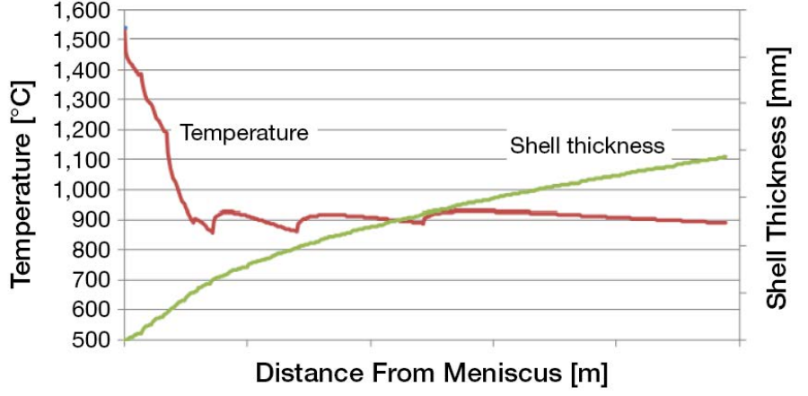 图5 在二冷过程中,温度和固态坯壳厚度随距离弯月面距离的变化