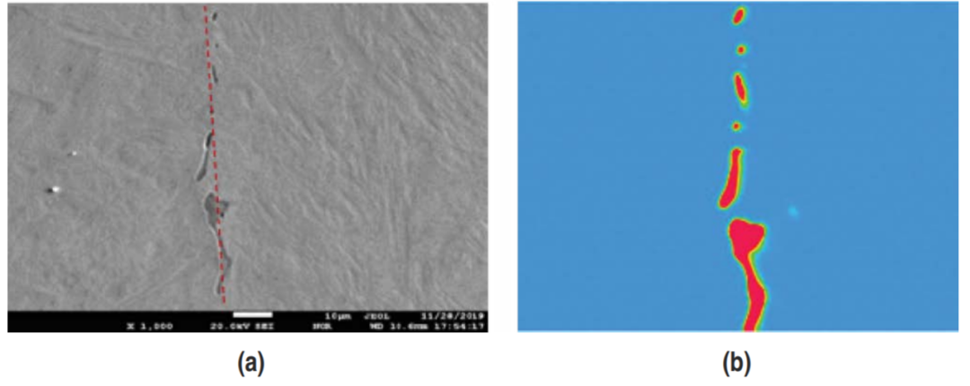 图9 晶界上的硫偏析:(a)板坯表面,(b)红色的硫偏析