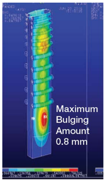 PosMC有引导夹持辊,被设计用来限制二冷室内铸坯出现鼓肚现象,如图6所示,考虑静钢水静压作用,计算出的最大鼓肚量为0.8 mm,鼓肚应变为0.2%,满足铸坯设计标准。为了强化PosMC铸机的扇形段,图6中采用对轧辊冷却效率更高的螺旋辊代替实心辊,通过计算预测,夹持辊与铸坯的接触温度可达340℃,冷却效果优于固体实心夹持辊。