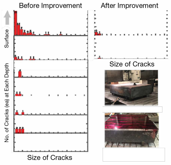 通过表面各深度的加工和渗透液测试对表面裂纹进行定量评价,如图11所示。通过提高钢坯表面温度,钢坯表面裂纹的深度和分布都得到了显著改善,使特厚钢板首次上市销售。