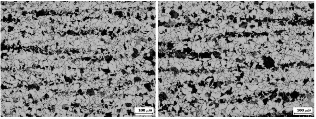 图13为200mmt板在5% 硝酸腐蚀液蚀刻后的四分之一和中心位置的微观组织结构,珠光体体积分数约为15%,铁素体平均晶粒尺寸分别为26µm和32µm。由于均匀的铁素体晶粒形成贯穿厚度,这样就获得均匀的力学性能。