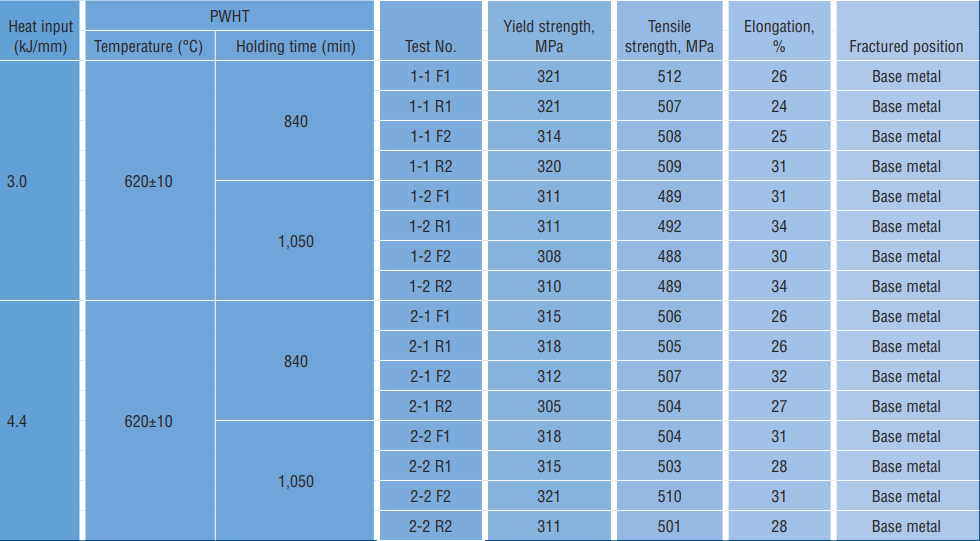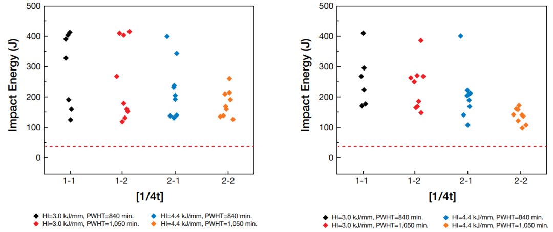 从表4可以看出,PWHT后的试样均在母材处断裂,屈服强度、抗拉强度和延伸率与母材几乎处于同一水平。图16显示了在-30℃下根据热输入和PWHT条件评估的热影响区冲击韧性测试结果。从以上结果可以确定,在-29℃低温下,至少有100 J,韧性可以得到保证。