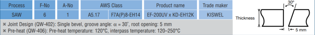 钢板的详细焊接条件见表3。200mmt板采用埋弧焊焊接;开槽角30˚,根部开口5mm。预热温度为120℃,焊层间温度设计为120 - 250℃。