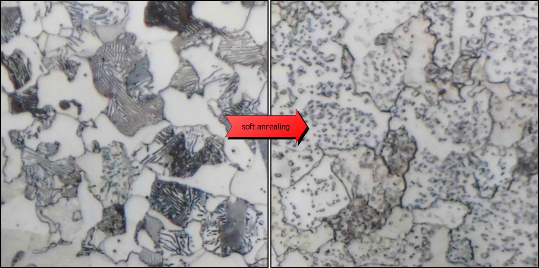 在软化退火过程中,亚共析钢被刚好加热到PS线以下,这样渗碳体就不会分解。层状渗碳体现在有足够的时间通过扩散过程转变成热力学上更有利的圆形。珠光体中的条状渗碳体转变为球状渗碳体。渗碳体分解成圆形后,钢慢慢冷却。与亚共析钢相比,过共析钢在软化退火过程中加热,温度略高于或围绕PSK线振荡。