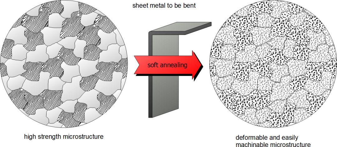 并非所有材料都必须设计成能承受很高的机械载荷。例如,对于带有铣槽的弯曲金属板,材料不必能够吸收高强度的力。相反,材料选择的重点是钢的良好成形性和可加工性。为了生产更经济,这在大批量自动化生产中发挥着重要作用。因此,可能有必要调整钢的微观结构,使其能够更好地成形和/或加工。特别是在成形性方面,因此有必要产生相应的软化组织。这可以通过所谓的软化退火来实现。