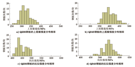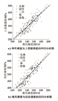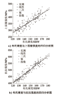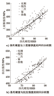 选取钢结构工程中常用的Q235和Q345两种牌号的钢板作为研究对象。为了使样品具有代表性,从江苏省内86家钢结构制造企业收集162块钢板,包括82块Q235钢板和80块Q345钢板,钢板厚度规格为6,8,10,12,14,18,20,30 mm。 将钢板加工成20mm×400mm的条形试样,按照GB/T 228.1—2010的要求使用微机控制电液伺服拉伸试验机进行拉伸试验。把Q235钢板和Q345钢板的上屈服强度、抗拉强度的检测结果分别进行统计分析,分布频率如图1所示。 图1 Q235钢板和Q345钢板的强度分布频率 从图1可以看出,Q235钢板的上屈服强度范围为261~382MPa,抗拉强度范围为404~497MPa;Q345钢板的上屈服强度范围为345~477MPa,抗拉强度范围为473~607MPa。强度频率分布基本成正态分布,检测结果和日常委托检验经验数据总体上是一致的,可以认为样品具有很好的代表性。 2 试验结果与分析 将试验样品按照标准要求进行取样加工,分别进行洛氏硬度、维氏硬度、布氏硬度和拉伸试验,按照最小二乘法原理,利用SPSS软件对硬度与强度检测结果分别进行回归分析。 2.1 洛氏硬度与强度相关性 2.1.1 洛氏硬度试验结果与分析 用砂轮机对试样表面进行打磨,使试样表面平坦光滑。选择B标尺,用标准硬度块对仪器进行校核后,按照GB/T 230.1—2018《金属材料 洛氏硬度试验 第1部分:试验方法》的要求进行洛氏硬度试验。每个样品测3个点,取平均值。 图2 洛氏硬度与强度的回归分析图 利用SPSS软件对洛氏硬度与上屈服强度、抗拉强度分别进行线性回归、二次方回归、乘幂回归和指数回归分析,回归分析图如图2所示,回归结果见表1和表2。 表1 洛氏硬度与上屈服强度的回归模型数据 表2 洛氏硬度与抗拉强度的回归模型数据 从表1和表2可以看出,洛氏硬度与强度呈现较好的相关性,与抗拉强度的相关性优于与上屈服强度的相关性。洛氏硬度与强度关系的4种回归模型中,显著性P均小于0.05,拟合优度R2比较接近,考虑标准给出的低碳钢洛氏硬度与抗拉强度之间换算关系接近于多项式模型,建议按照二次方模型进行换算,拟合后公式为 式中:ReH为上屈服强度;Rm为抗拉强度;HRB为洛氏硬度。 2.1.2 换算结果相对偏差分析 根据拟合的二次方回归模型,分别计算出上屈服强度、抗拉强度换算值与拉伸试验结果的相对偏差,并对相对偏差进行统计分析,统计量为162个,结果见表3,相对偏差基本呈正态分布,频率分布如图3所示。 表3 洛氏硬度换算为强度的相对偏差统计表 图3 洛氏硬度换算为强度的相对偏差 2.1.3 与国家标准换算值的比较 将标准给出的抗拉强度换算值、拟合的二次方回归公式换算值,以及洛氏硬度与抗拉强度对应关系的散点图放在同一张图上进行对比,如图4所示。 图4 各洛氏硬度换算的抗拉强度的对比图 从图4中可以看出,3条曲线总体趋势是一致的。GB/T 1172—1999给出的抗拉强度换算值与作者给出的换算值较为接近,在370~630MPa内二者平均偏差2.7%,最大偏差5.7%。GB/T 33362—2016给出的抗拉强度换算值,对于Q235钢(抗拉强度370~500MPa)来说偏低,对于Q345钢(抗拉强度470~630MPa)来说偏高。 2.2 维氏硬度与强度相关性 2.2.1 维氏硬度试验过程与结果分析 使用砂轮机对试样表面打磨后进行表面抛光处理,用标准硬度块对仪器进行校核后,按照GB/T 4340.1—2009《金属材料 维氏硬度试验 第1部分:试验方法》的要求进行维氏硬度检测。每个试样测3个点,取平均值。 利用SPSS软件对维氏硬度与上屈服强度、抗拉强度分别进行线性回归、二次方回归、乘幂回归和指数回归分析,回归分析图如图5所示,回归结果见表4和表5。 表4 维氏硬度与上屈服强度的回归模型数据 图5 维氏硬度与强度的回归分析图 表5 维氏硬度与抗拉强度的回归模型数据 从表4和表5可以看出,维氏硬度与强度呈现较好的相关性,与抗拉强度的相关性优于与上屈服强度的相关性。维氏硬度与强度关系的4种回归模型中,显著性P均小于0.05,拟合优度R2比较接近,考虑标准给出的低碳钢维氏硬度与抗拉强度之间换算关系接近于线性关系,建议按照线性关系进行换算,拟合后公式为 式中:HV为维氏硬度。 2.2.2 换算结果相对偏差分析 根据拟合的线性回归模型,分别计算出上屈服强度、抗拉强度换算值与拉伸试验结果的相对偏差,并对相对偏差进行统计分析,统计量为162个,结果见表6,相对偏差基本呈正态分布,频率分布如图6所示。 表6 维氏硬度换算为强度的相对偏差统计表 图6 维氏硬度换算为强度的相对偏差 2.2.3 与国家标准换算值的比较 将标准给出的抗拉强度换算值、作者拟合的线性回归公式换算值,以及维氏硬度与抗拉强度对应关系的散点图放在同一张图上进行对比,如图7所示。 图7 各维氏硬度换算的抗拉强度的对比图 从7图中可以看出,3条曲线总体趋势是一致的。GB/T 1172—1999给出的抗拉强度换算值与作者给出的换算值非常接近,在370~630MPa范围内,随着硬度值的增大,二者之间的差值略有增大,平均偏差为1.2%,最大偏差3.3%。GB/T 33362—2016给出的抗拉强度换算值总体上略低一些。 2.3 布氏硬度与强度相关性 2.3.1 布氏硬度试验过程与结果分析 使用砂轮机对试样表面打磨,使表面粗糙度不大于1.6μm。用标准硬度块对仪器进行校核后,按照GB/T 231.1—2018《金属材料 布氏硬度试验 第1部分:试验方法》的要求进行布氏硬度试验。采用直径10mm的硬质合金压头,试验力29.42kN。每个试样测3个点,取平均值。 利用SPSS软件对洛氏硬度与