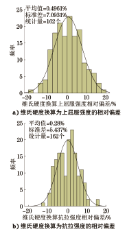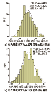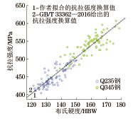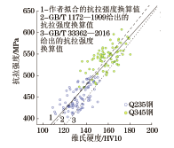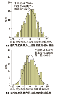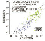 由硬度推算抗拉强度,目前可以依据的国内标准主要有GB/T 33362—2016《金属材料 硬度值的换算》和GB/T 1172—1999《黑色金属硬度及强度换算值》。GB/T 33362—2016使用翻译法等同采用ISO 18265:2013《金属材料 硬度值换算》(英文版),该标准中表A.1给出的非合金钢、低合金钢与铸钢硬度换算表,是由德国冶金工程师协会在多个不同试验室中使用经检验和校准的硬度计进行比对试验得出的。GB/T 1172—1999是由中国计量科学研究院等多家研究机构经过大量试验研究得出的,标准中的表2给出了主要适用于低碳钢的换算关系。但这两个标准都没有给出换算值不确定度的具有统计意义的可靠数据,对于换算结果的偏差范围无从得知。