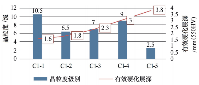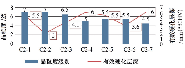 7组18CrNiMo7-6钢渗碳再加热淬火工艺结果见表5,从中可以看出,工艺方案C2-7(940℃保温150h),晶粒粗化程度达到了4.5级,处于可接受的边缘,晶粒形貌如图3所示。有效硬化层深、晶粒度随渗碳温度/时间变化关系如图4所示。