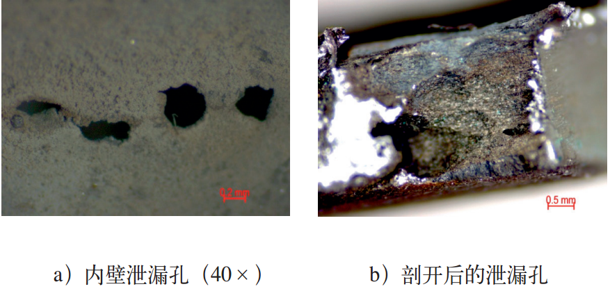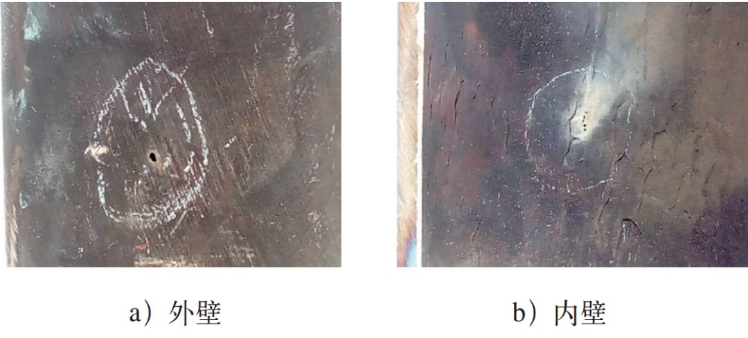 316L属于奥氏体不锈钢,对应国内牌号为022Cr17Ni12Mo2,具有良好的塑性和耐蚀性,该不锈钢中添加的Mo元素极大地提高了其抗点蚀能力。因此,316L不锈钢被广泛应用于石化、医药等行业。某企业使用的316L不锈钢盘管在使用过程中发现管壁泄漏穿孔现象。管内工作介质为水蒸汽,工作压力0.9MPa,管外介质为强碱、铜粉,工作压力1.0MPa,内外壁存在压力差。笔者对其失效原因进行了试验分析和研究。从外部宏观目视检查发现,泄漏孔在外壁显示为一个直径约2mm的小孔,如图1a所示。在内壁显示为4个直径约为1mm的纵向排列小孔,并可见大量“翘皮”状裂纹,如图1b所示。