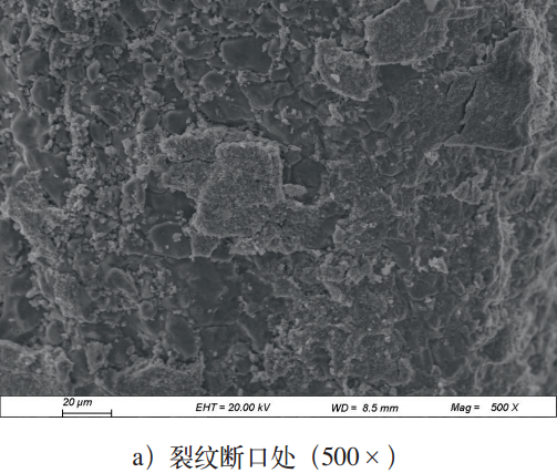 对裂纹断口处采用扫描电镜观察,图7a为陈旧断口,从图7b泄漏孔内壁形貌可以看出,表面上均存在“泥纹花样”腐蚀产物。