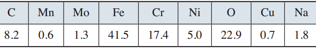 对图7a陈旧断口取样进行能谱分析,如图8所示,结果见表4,腐蚀产物较为复杂,主要成分为氧化物,还夹杂有Cu、Na等。
